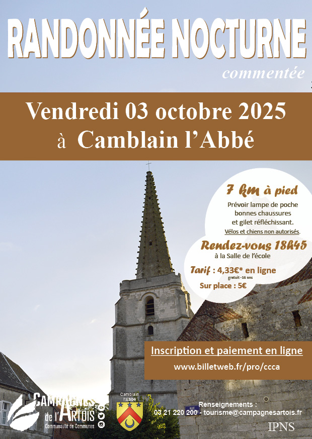 Information au 03 21 220 200 ou tourisme @campagnesartois.fr