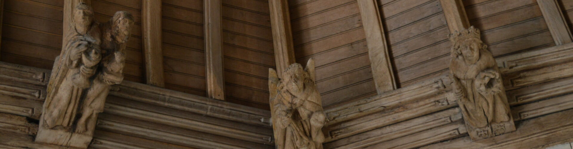 Une fois la porte franchie, c’est une magnifique voûte en bois qui se dévoile, décorée de 15 blochets en chêne sculpté représentant une assemblée de Saints.