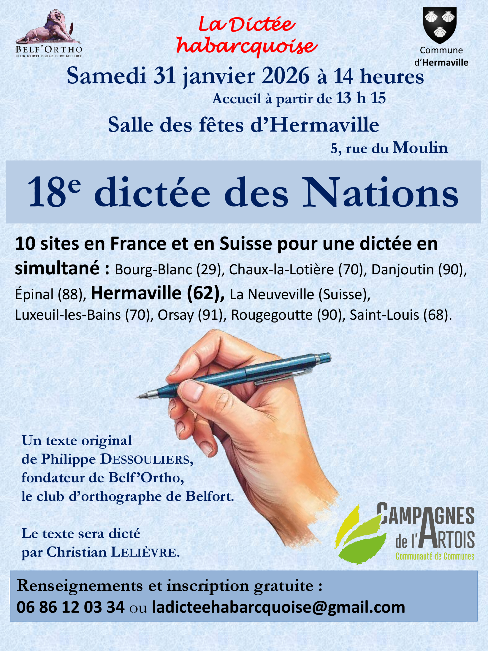 Rendez-vous le samedi 31 janvier 2026 à 14h à la salle des fêtes d’Hermaville pour participer à la 18e Dictée des Nations, organisée en simultané avec plusieurs villes en France et en Suisse.