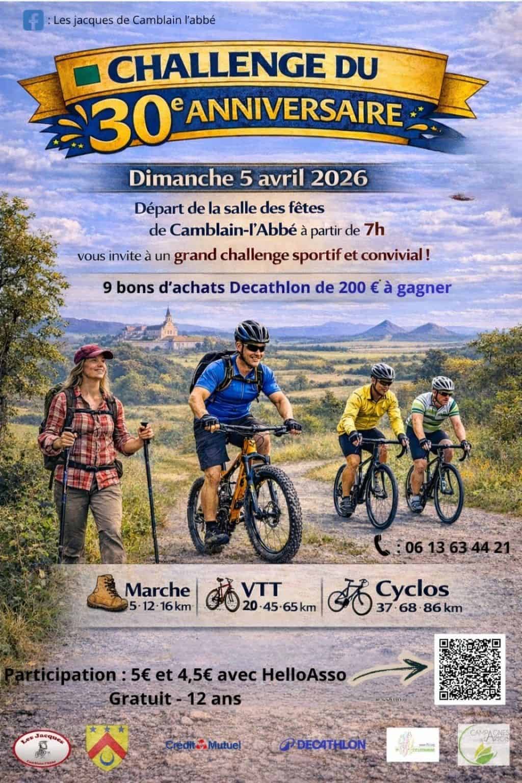 Rendez-vous le dimanche 5 avril 2026 dès 7h à la salle des fêtes de Camblain-l’Abbé pour le 30ᵉ Challenge des Jacques avec marche, VTT et cyclo.