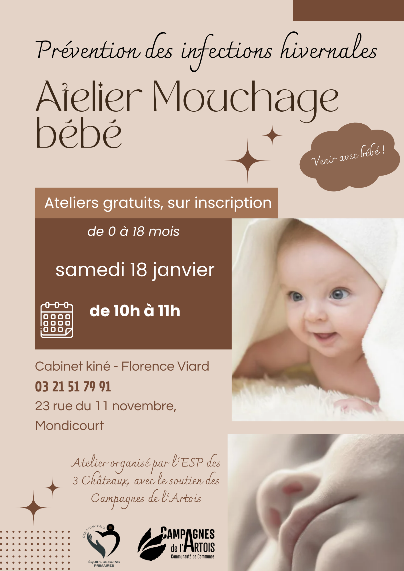 Rendez-vous à l'Atelier Mouchage bébé à Mondicourt, le samedi 18 janvier de 10 h à 11 h.