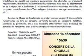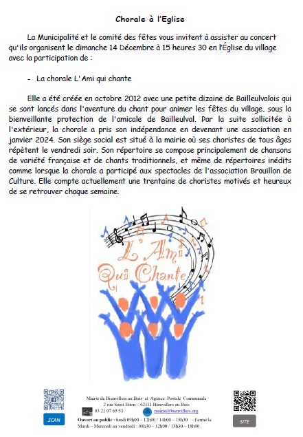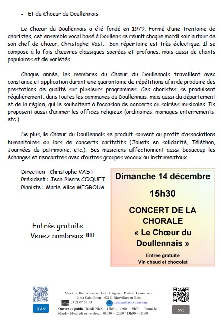 Rendez-vous dimanche 14 décembre 2025 à 15h30 à l’église de Bienvillers-au-Bois pour un concert gratuit réunissant le Chœur du Doullennais et la chorale L’Ami qui chante, suivi d’un moment convivial autour de chocolat et vin chaud.