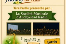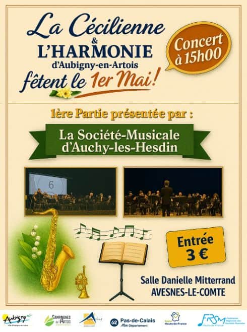 Vendredi 1er mai 2026 à 15h, La Cécilienne et l’Harmonie d’Aubigny-en-Artois fêtent le 1er mai en concert à la salle Danielle Mitterrand d’Avesnes-le-Comte, avec la Société Musicale d’Auchy-lès-Hesdin.