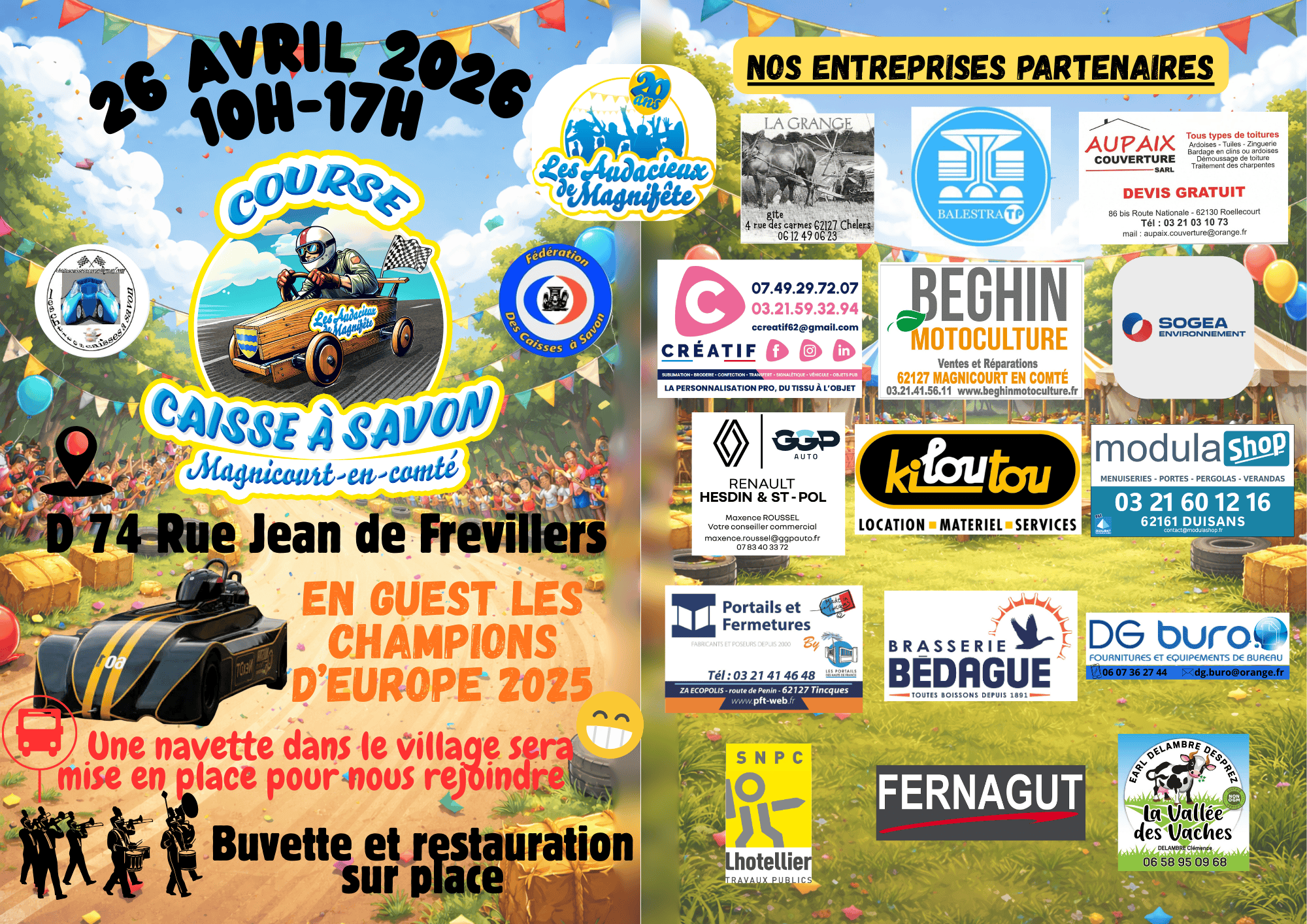 Les Audacieux de Magnicourt organisent une course de caisses à savon samedi 26 avril 2026 de 10h à 17h, rue Jean de Frevillers à Magnicourt-en-Comté. Présence des champions d’Europe 2025, navette dans le village, buvette et restauration sur place.