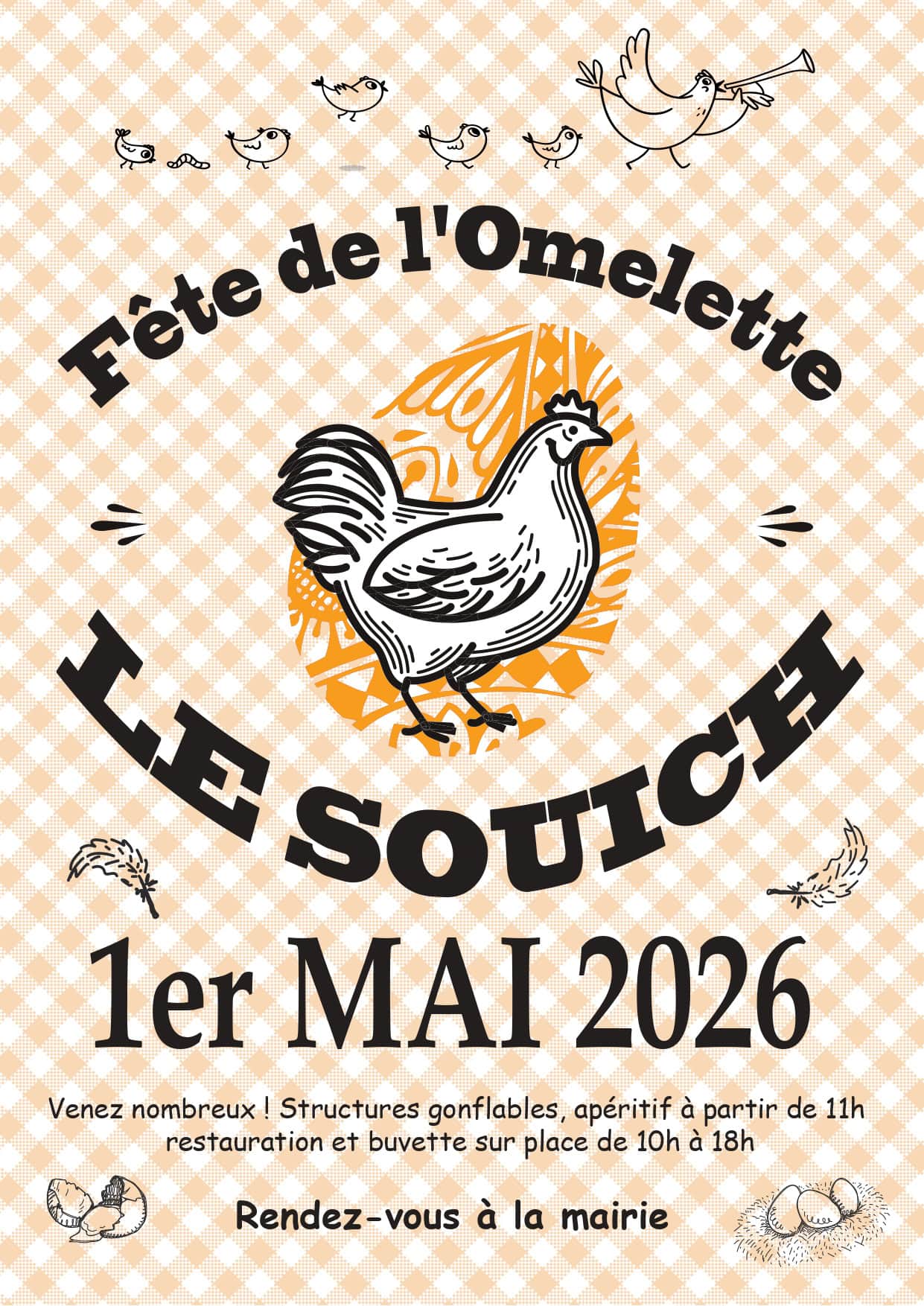 Rendez-vous le 1er mai 2026 à Le Souich pour la Fête de l’Omelette. Structures gonflables, apéritif à partir de 11h, restauration et buvette sur place de 10h à 18h. Rendez-vous à la mairie.
