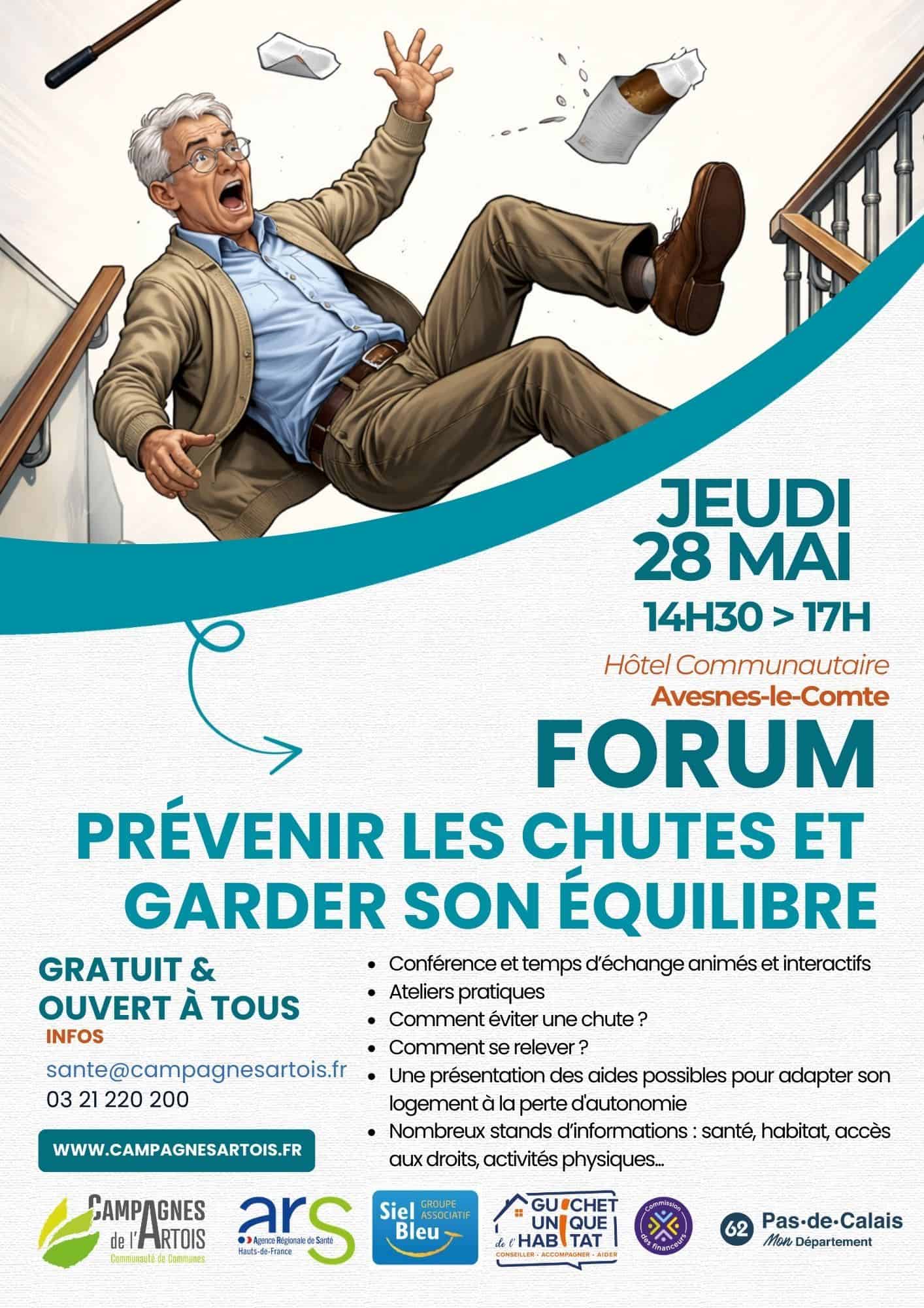 La Communauté de Communes des Campagnes de l’Artois et ses partenaires vous proposent de participer à un Forum «Prévenir les chutes et garder son équilibre” qui aura lieu le Jeudi 28 Mai de 14h30 à 17h00 à l’hôtel communautaire à Avesnes le Comte.
