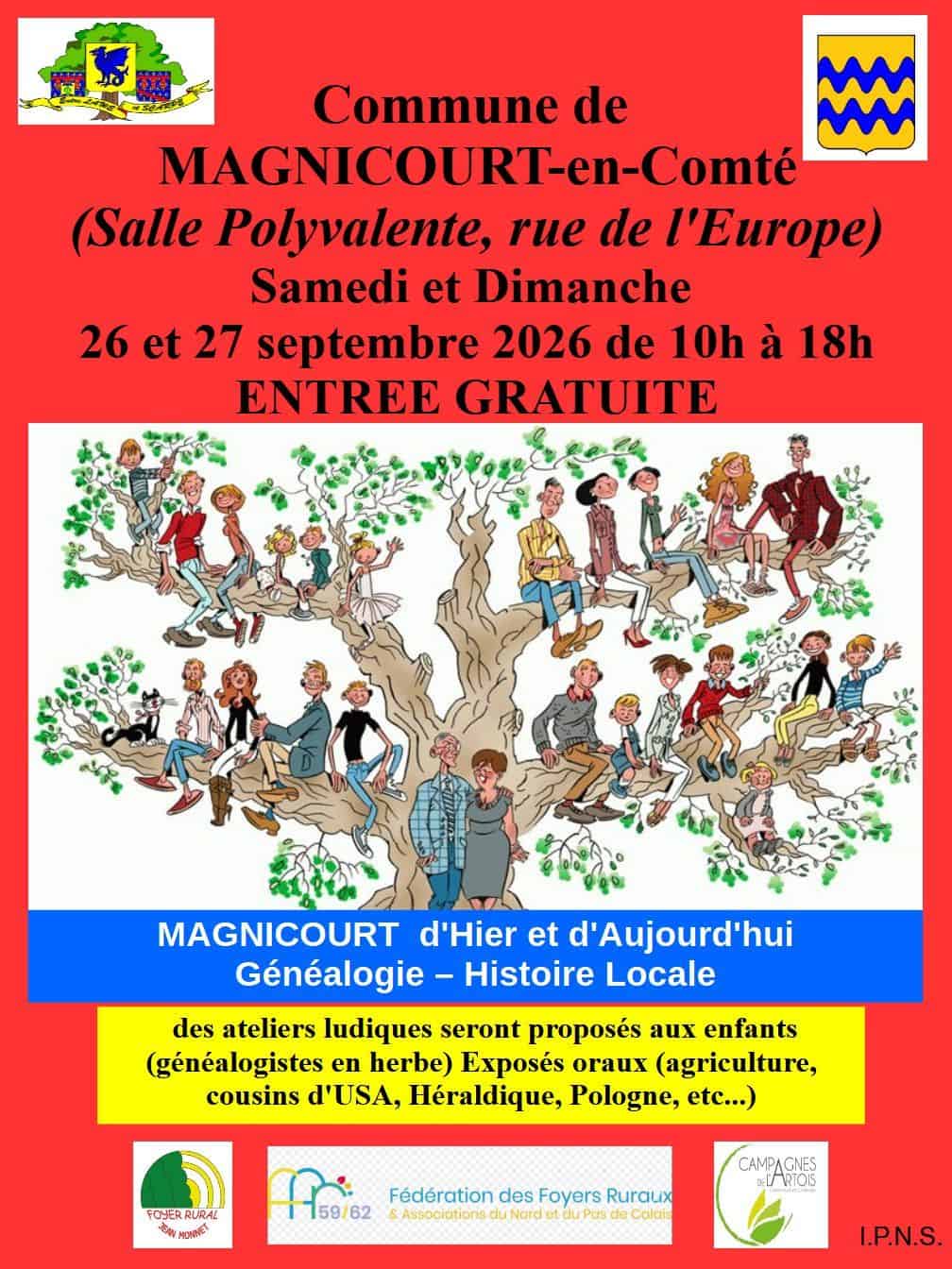 La commune de Magnicourt-en-Comté propose un week-end dédié à la généalogie et à l’histoire locale les samedi 26 et dimanche 27 septembre 2026, de 10h à 18h, salle polyvalente rue de l’Europe. Entrée gratuite avec ateliers ludiques pour enfants et exposés thématiques.