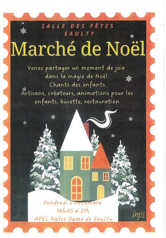 Rendez-vous vendredi 5 décembre 2025 de 16h45 à 21h à la salle des fêtes de Saulty pour un marché de Noël chaleureux avec artisans, animations et chants d’enfants