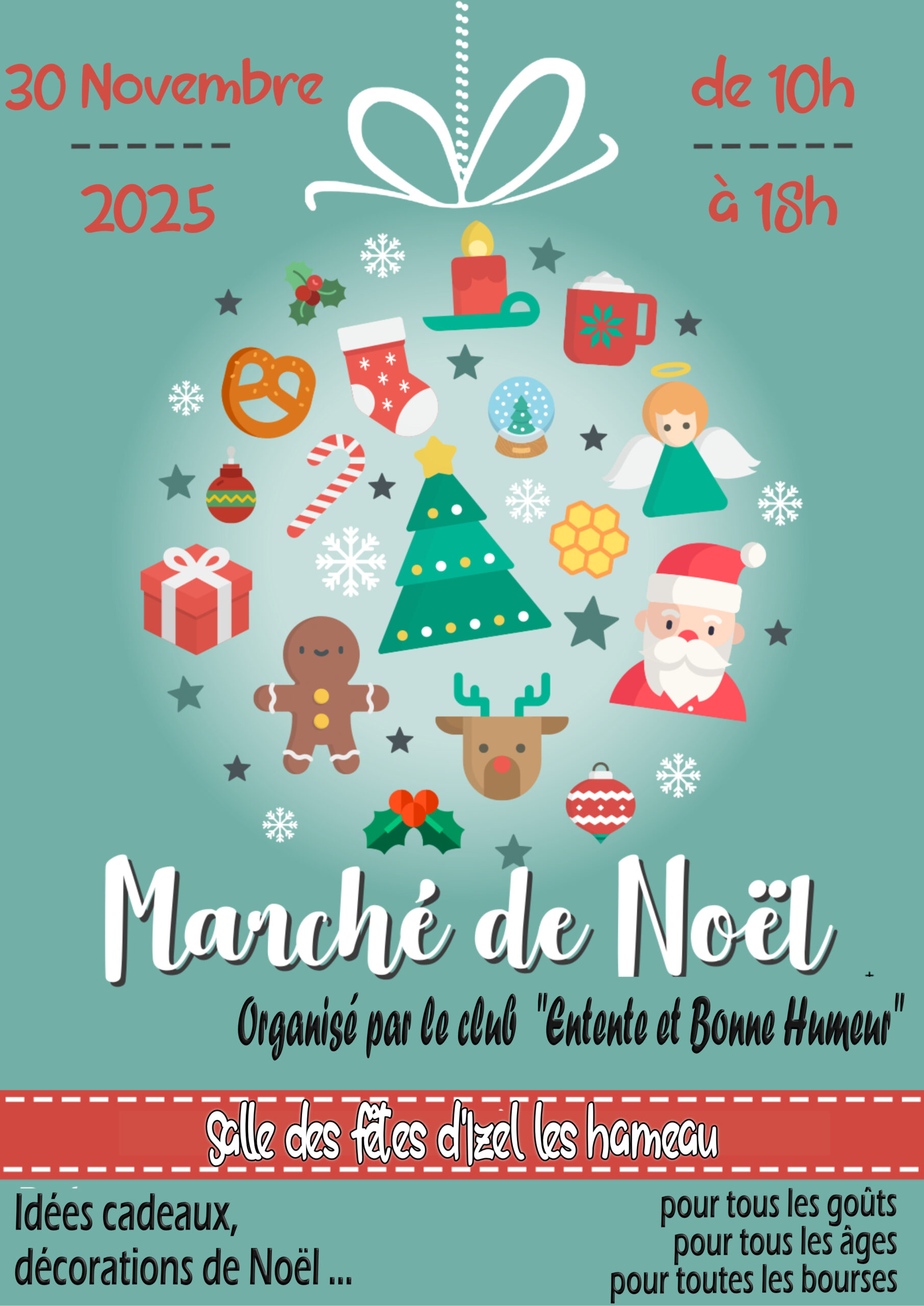 Rendez-vous le dimanche 30 novembre à la salle des fêtes d’Izel-les-Hameau pour un marché de Noël convivial, plein d’idées cadeaux et de décorations festives.
