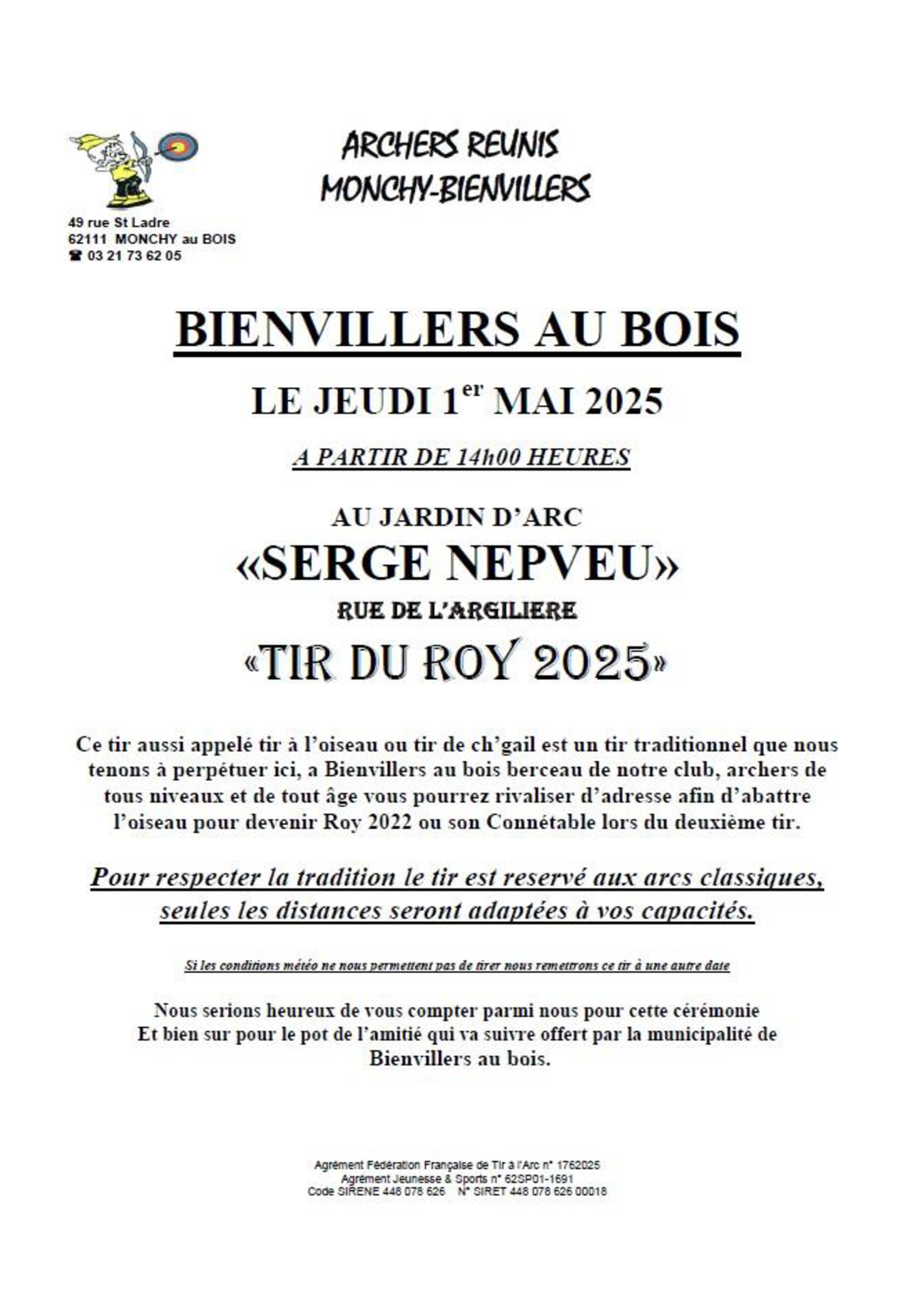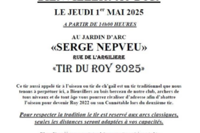 Rendez-vous jeudi 1er mai 2025 à partir de 14h au jardin d'arc "Serge Nepveu" pour le traditionnel Tir du Roy réservé aux arcs classiques.